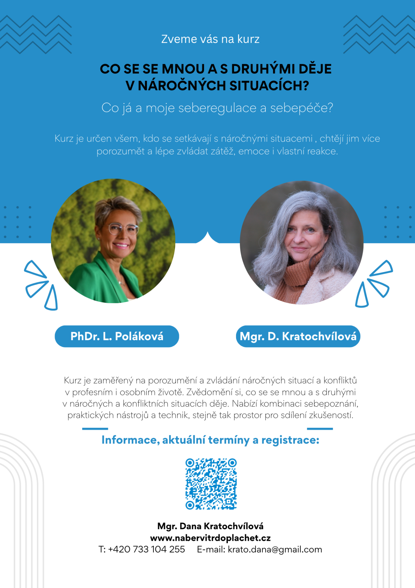 Kurz je zaměřený na porozumění a zvládání náročných situací a konfliktů v profesním i osobním životě. Zvědomění si, co se se mnou a s druhými v náročných, konfliktních situacích děje. Kurz nabízí kombinaci sebepoznání, praktických nástrojů a technik, stejně tak prostor pro sdílení zkušeností.